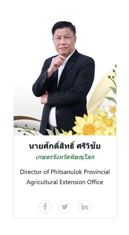 นางสาววลัยพร ชนกกำชัย หัวหน้ากลุ่มยุทธศาสตร์และสารสนเทศ นายพจน์ จรูญชัย หัวหน้ากลุ่มส่งเสริมและพัฒนาเกษตรกร นายฐิติพงษ์ มีมาก หัวหน้ากลุ่มส่งเสริมและพัฒนาการผลิต นางสาวพีรดา จันทร์เกษร หัวหน้ากลุ่มอารักขาพืช ฝ่ายบริหารทั่วไป นางสาวณัฐรดา ใจเก่งดี หัวหน้าฝ่ายบริหารทั่วไป นางเสาวคนธ์ เชื้อผู้ดี เจ้าพนักงานธุรการชำนาญงาน นางจุฑามาศ รอดสุขเจริญ เจ้าพนักงานการเงินและบัญชีชำนาญงาน นางอังคณา คุ้มแสง เจ้าพนักงานธุรการชำนาญงาน นางสาวเพ็ญทิวา ค้าข้าว จ้าพนักงานการเงินและบัญชีปฏิบัติงาน นางสาวดาวเรือง แสนคำราง เจ้าพนักงานธุรการ นางสาวรัตนาภรณ์ เอี่ยมสำอาง เจ้าพนักงานธุรการ นางสาวพัชลี เครือหงษ์ เจ้าหน้าที่บันทึกข้อมูล นายชาญ อินทร์เรือง พนักงานขับรถยนต์ 2 นางสาวณัฐรดา ใจเก่งดี พนักงานขับรถยนต์ <br> กลุ่มยุทธศาสตร์สารสนเทศ นางสาววลัยพร ชนกกำชัย หัวหน้ากลุ่มยุทธศาสตร์และสารสนเทศ นางสาวธัญญาวรรณ เรือนทิพย์ นักวิชาการส่งเสริมการเกษตรชำนาญการ นางศิริพร โปร่งเจริญ นักวิชาการส่งเสริมการเกษตรชำนาญการ นางสาวมยุเรศ เทศหริ่ง นักวิชาการส่งเสริมการเกษตรชำนาญการ นายจีรพงษ์ จุลพันธ์ นักวิชาการส่งเสริมการเกษตรปฏิบัติการ กลุ่มกลุ่มส่งเสริมและพัฒนาการผลิต นายฐิติพงษ์ มีมาก หัวหน้ากลุ่มส่งเสริมและพัฒนาการผลิต นางรสจรินทร์ หลวงโปธา นักวิชาการส่งเสริมการเกษตรชำนาญการ นางสาวกนกพร จรูญชัย นักวิชาการส่งเสริมการเกษตรชำนาญการ นายจีรวุฒิ พานิชอำนวย นักวิชาการส่งเสริมการเกษตรชำนาญการ นางสาวกัญญา ทาสีธง นักวิชาการส่งเสริมการเกษตรปฏิบัติการ กลุ่มส่งเสริมและพัฒนาเกษตรกร นางสาวณัฐรดา ใจเก่งดี นางพุทธิพร เถื่อนใหญ่ นักวิชาการส่งเสริมการเกษตรชำนาญการ นางสาวฉัตรแก้ว วิรบุตร์ นักวิชาการส่งเสริมการเกษตรชำนาญการ นางสาวกมลนัช ปันสุพฤกษ์ นักวิชาการส่งเสริมการเกษตรปฏิบัติการ นางสาวจิราพร ศรีสกุล นักวิชาการส่งเสริมการเกษตรปฏิบัติการ นางสาวณัฐรดา ใจเก่งดี นักวิชาการส่งเสริมการเกษตรปฏิบัติการ กลุ่มอารักขาพืช นางสาวพีรดา จันทร์เกษร หัวหน้ากลุ่มอารักขาพืช นางสาวสุพัชชา สุขน้อย นักวิชาการส่งเสริมการเกษตรชำนาญการ นางพิรุฬห์วัลย์ อิ่มอ่อง นักวิชาการส่งเสริมการเกษตรชำนาญการ นายสุรศักดิ์ ทองม่วง นักวิชาการส่งเสริมการเกษตรปฏิบัติการ คุณฐิติพันธุ์ ภู่ขาว นักวิชาการส่งเสริมการเกษตรปฏิบัติการ เกษตรอำเภอ นางเนาวรัตน์ แก้วแจ้ง เกษตรอำเภอเมืองพิษณุโลก นางปฏิญญา ทองสนิท เกษตรอำเภอบางระกำ นายนพดล สีอ่อน เกษตรอำเภอชาต