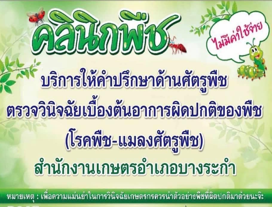 สำนักงานเกษตรอำเภอบางระกำ ขอประชาสัมพันธ์ คลินิกพืช…บริการให้คำปรึกษาด้านศัตรูพืช ตรวจวินิจฉัยอาการผิดปกติของพืชเบื้องต้น…ทุกวันจันทร์ ตั้งแต่เวลา 10.00 – 12.00 น. ณ สำนักงานเกษตรอำเภอบางระกำฟรี…ไม่มีค่าใช้จ่าย หมายเหตุ : เพื่อให้ได้ผลที่แม่นยำควรนำตัวอย่างพืชที่เกิดอาการผิ…