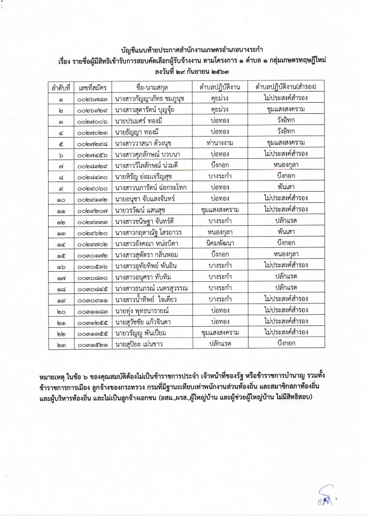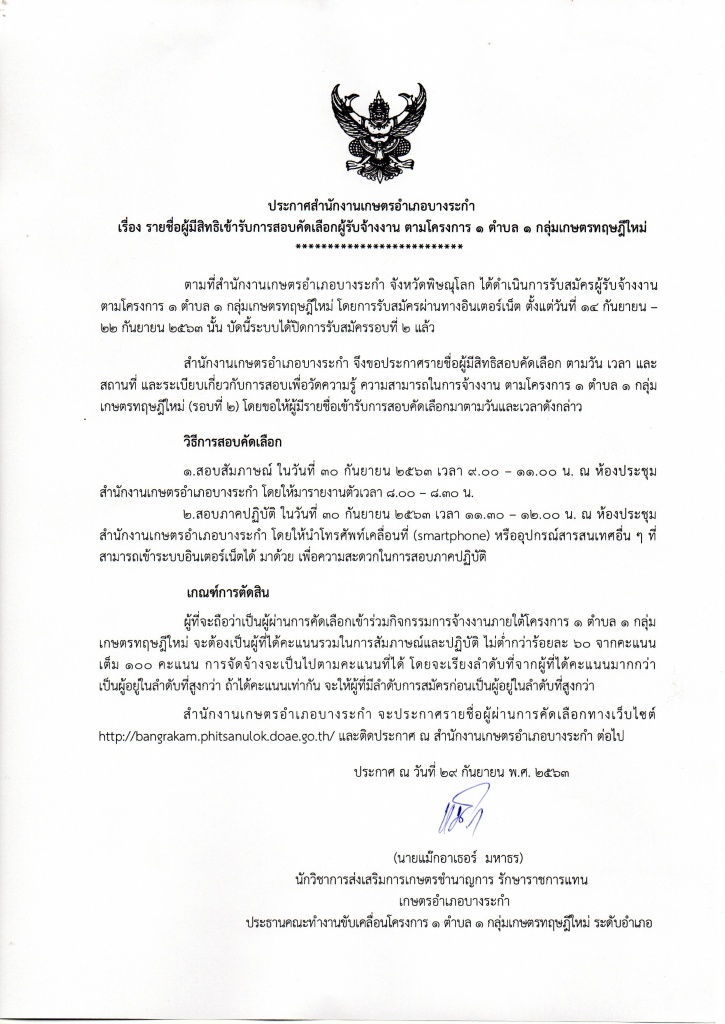 ประกาศรายชื่อ ผู้มีสิทธิเข้ารับการสอบคัดเลือกผู้รับจ้างงาน ตามโครงการ 1 ตำบล 1 กลุ่มเกษตรทฤษฎีใหม่ (รอบที่2)