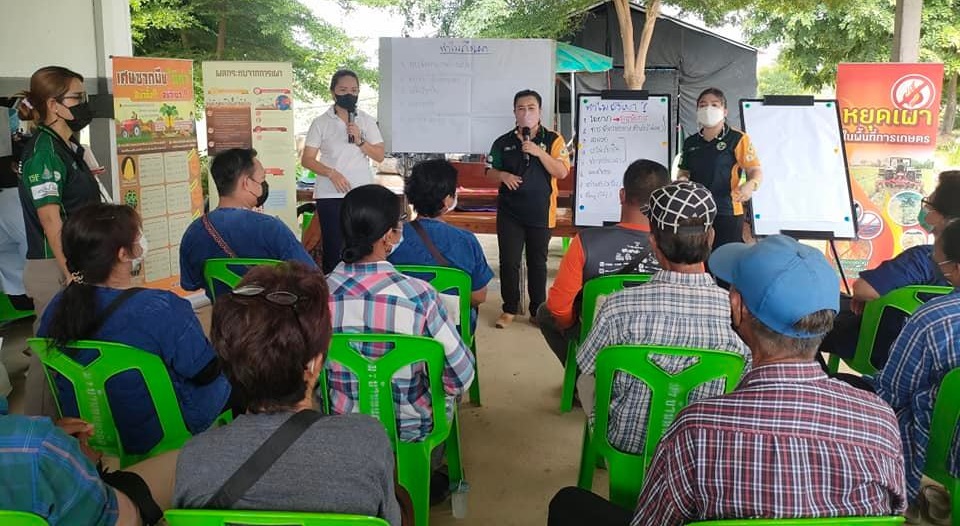จัดเวทีชุมชน. ตามโครงการส่งเสริมการหยุดเผาในพื้นที่การเกษตร ปี 2565 กิจกรรม ส่งเสริมการรวมกลุ่ม & สร้าง เครือข่ายเกษตรกรปลอดการเผา ทั้งนี้มีสาธิต การทำ “กระถางจากฟางข้าว”