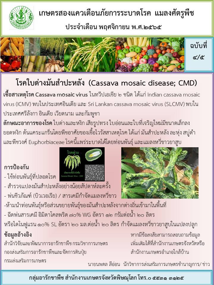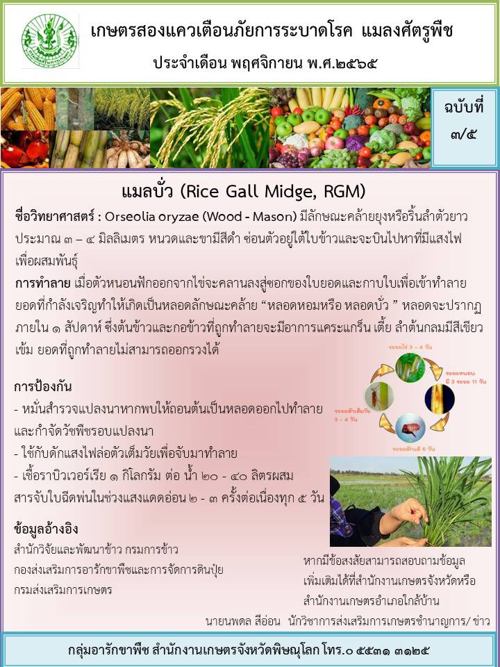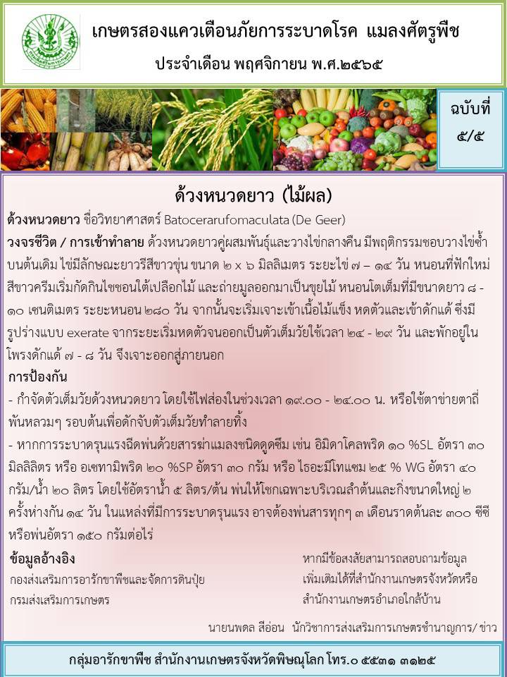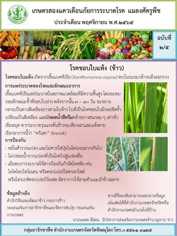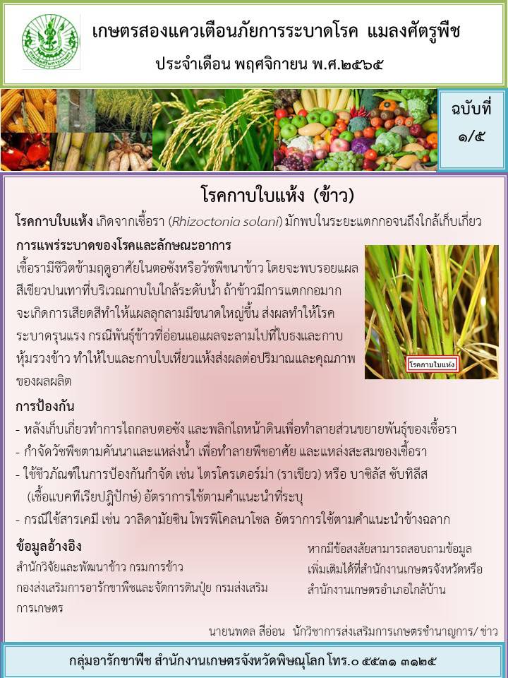 ขอแจ้งเตือนภัยการระบาดโรคและศัตรูพืชประจำเดือนตุลาคม 2565 ที่คาดว่าจะพบการระบาดในเดือนพฤศจิกายน 2565 ขอให้เกษตรกรในพื้นที่สำรวจ เฝ้าระวัง และป้องกันตามคำแนะนำ