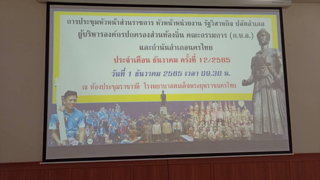 วันที่ 1 ธันวาคม 2565 นางปฏิญญา ทองสนิท นักวิชาการส่งเสริมการเกษตรชำนาญการ รักษาราชการแทนเกษตรอำเภอนครไทย เข้าร่วมประชุมหัวหน้าส่วนราชการ หัวหน้าหน่วยงาน รัฐวิสาหกิจ ปลัดอำเภอ ผู้บริหารองค์กรปกครองส่วนท้องถิ่น คณะกรรมการ (ก.บ.อ.) และกำนันอำเภอนครไทย ประจำเดือนธันวาคม 2565 เพื่อรับทราบข้อราชการและแนวนโยบายการบริหารราชการของรัฐบาล กระทรวง และนโยบายผู้ว่าราชการจังหวัดพิษณุโลก และนำไปเป็นแนวทางปฏิบัติต่อไป ณ ห้องประชุมราชาวดี โรงพยาบาลสมเด็จพระยุพราชนครไทย อำเภอนครไทย จังหวัดพิษณุโลก