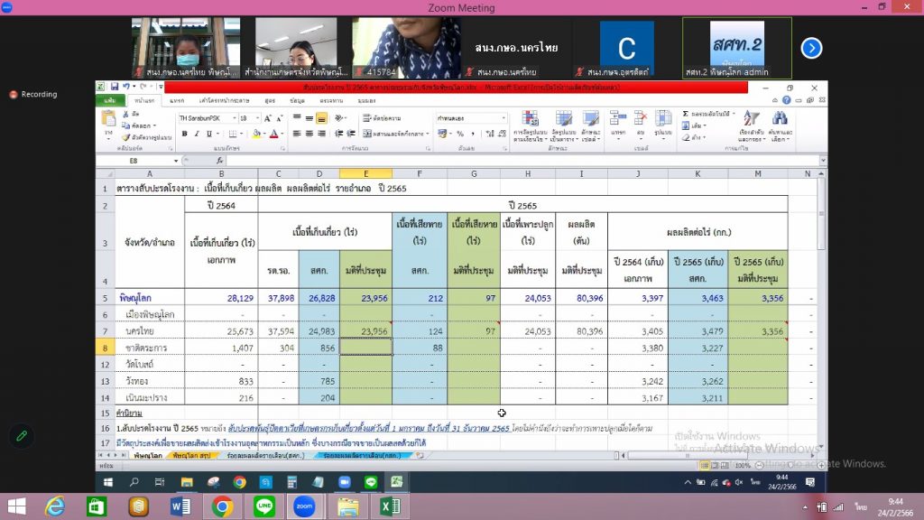 วันที่ 24 กุมภาพันธ์ 2566 นางปฏิญญา ทองสนิท เกษตรอำเภอนครไทย พร้อมด้วยนางสาวยุพา สิทธิไกรพงษ์ นักวิชาการส่งเสริมการเกษตรปฏิบัติการ ร่วมประชุมพิจารณาข้อมูลสินค้าสับปะรดโรงงาน ปี 2565 ระดับจังหวัด ผ่านระบบ Zoom เพื่อนำไปจัดทำข้อมูลและวางแผนบริหารจัดการสินค้าสับปะรดโรงงาน ณ ห้องสำนักงานเกษตรอำเภอนครไทย หมู่ที่ 7 ตำบลนครไทย อำเภอนครไทย จังหวัดพิษณุโลก