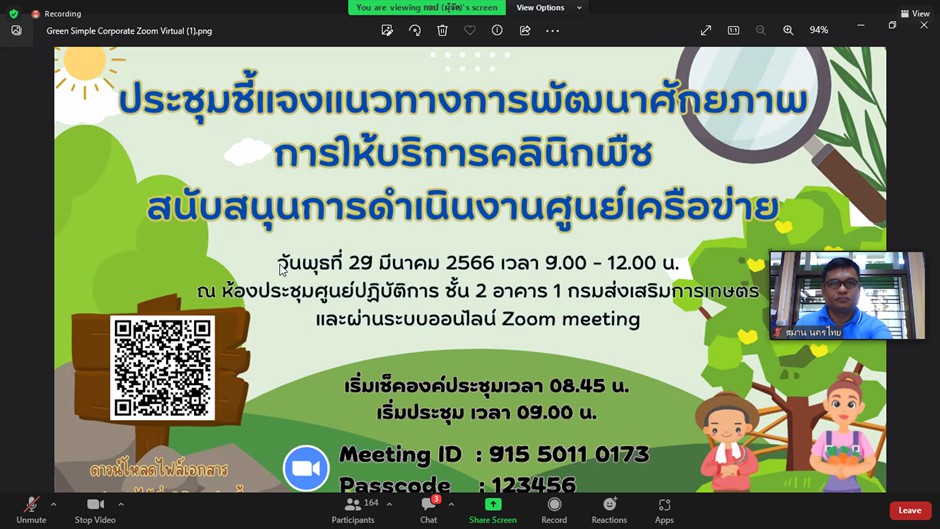 วันที่ 29 มีนาคม 2566 นางปฏิญญา ทองสนิท เกษตรอำเภอนครไทย มอบหมายให้นายสมาน ศรีทองอินทร์ นักวิชาการส่งเสริมการเกษตรชำนาญการ ร่วมประชุมชี้แจงแนวทางการพัฒนาศักยภาพการให้บริการคลินิกพืชสนับสนุนการดำเนินงานศูนย์เครือข่าย ผ่านระบบ Zoom Meeting เพื่อรับฟังการชี้แจงการดำเนินงานขับเคลื่อนงานพัฒนาศักยภาพหมอพืช หมอพืชชุมชน และการดำเนินงานคลินิกพืช ณ สำนักงานเกษตรอำเภอนครไทย หมู่ที่ 7 ตำบลนครไทย จังหวัดพิษณุโลก