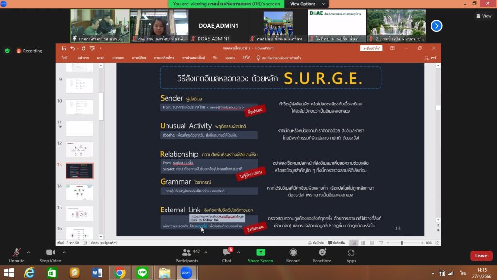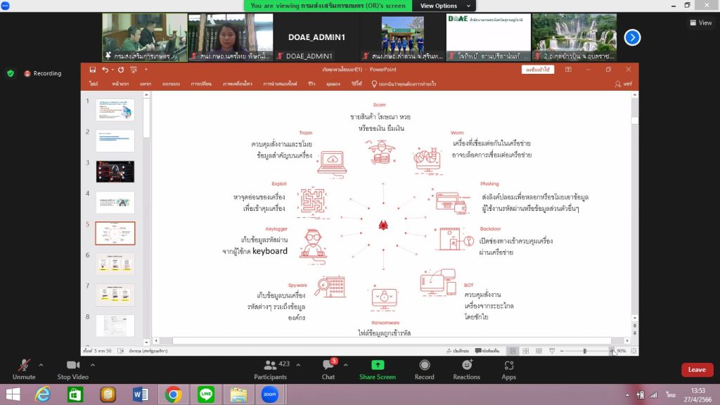 วันที่ 27 เมษายน 2566 นางปฏิญญา ทองสนิท เกษตรอำเภอนครไทย มอบหมายให้นางสาวยุพา สิทธิไกรพงษ์ นักวิชาการส่งเสริมการเกษตรปฏิบัติการ ร่วมกิจกรรมแลกเปลี่ยนเรียนรู้ CLINIC IT ครั้งที่ 3 ในหัวข้อ เรื่องภัยคุกคามทางไซเบอร์ พ.ร.บ. รักษาความมั่นคงทางไซเบอร์ พ.ศ.2562 และการดูแลระบบเครือข่าย Internet ผ่านระบบ Zoom โดย ทีมงานศูนย์เทคโนโลยีสารสนเทศและการสื่อสาร กับเจ้าหน้าที่ส่งเสริมการเกษตร ณ สำนักงานเกษตรอำเภอนครไทย หมู่ที่ 7 ตำบลนครไทย อำเภอนครไทย จังหวัดพิษณุโลก