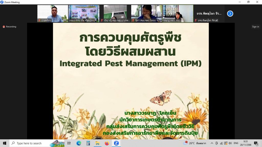 วันที่ 28 พฤศจิกายน 2566 นางปฏิญญา ทองสนิท เกษตรอำเภอนครไทย มอบหมายให้นายสมาน ศรีทองอินทร์ นักวิชาการส่งเสริมการเกษตรชำนาญการพิเศษ ร่วมอบรมโครงการพัฒนาศักยภาพเจ้าหน้าที่ส่งเสริมการเกษตรเพื่อเป็นวิทยากรพี่เลี้ยงตามกระบวนการโรงเรียนเกษตรกร หลักสูตรเรื่อง การบริหารจัดการศัตรูพืชโดยวิธีผสมผสาน จัดโดยกลุ่มอารักขาพืช สำนักงานเกษตรจังหวัดพิษณุโลก ผ่านระบบออนไลน์ Zoom Meeting ณ สำนักงานเกษตรอำเภอนครไทย จังหวัดพิษณุโลก