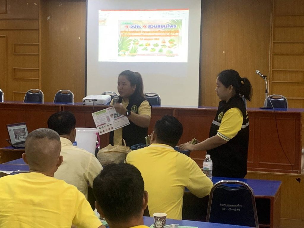 นางสาวปานทิพย์ วงษ์แก้ว เกษตรอำเภอนครไทย มอบหมายให้นางสาวดอกไม้ คงหนองลาน นักวิชาการส่งเสริมการเกษตรชำนาญการ และนางสาวยุพา สิทธิไกรพงษ์ นักวิชาการส่งเสริมการเกษตรปฏิบัติการ ร่วมเป็นวิทยากรโครงการ 1 อปท. 1 สวนสมุนไพร เฉลิมพระเกียรติพระบาทสมเด็จพระเจ้าอยู่หัว ประจำปี 2567 เพื่อให้ผู้เข้าร่วมอบรมมีความเข้าใจในความสำคัญของพืชสมุนไพรไทย เข้าใจวิธีการปลูก วิธีใช้ จัดโดยองค์การบริหารส่วนตำบลหนองกะท้าว ณ ห้องประชุมสภาองค์การบริหารส่วนตำบลหนองกะท้าว อำเภอนครไทย จังหวัดพิษณุโลก