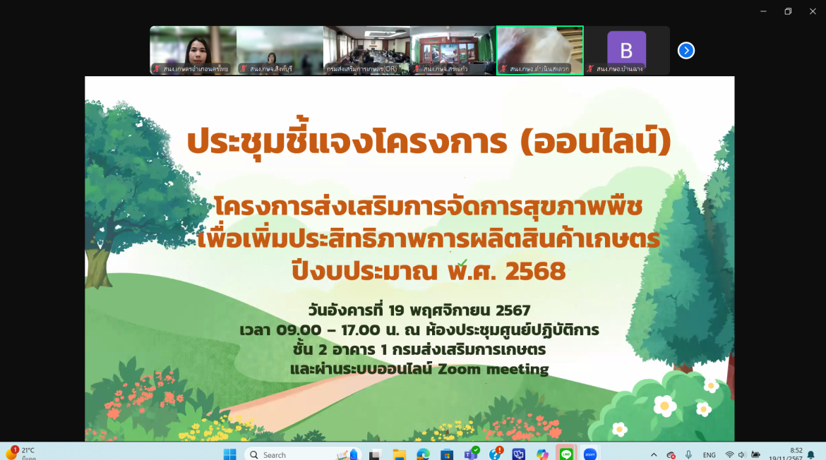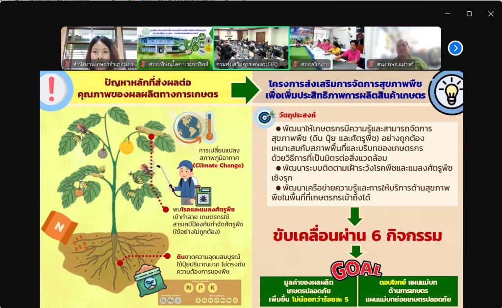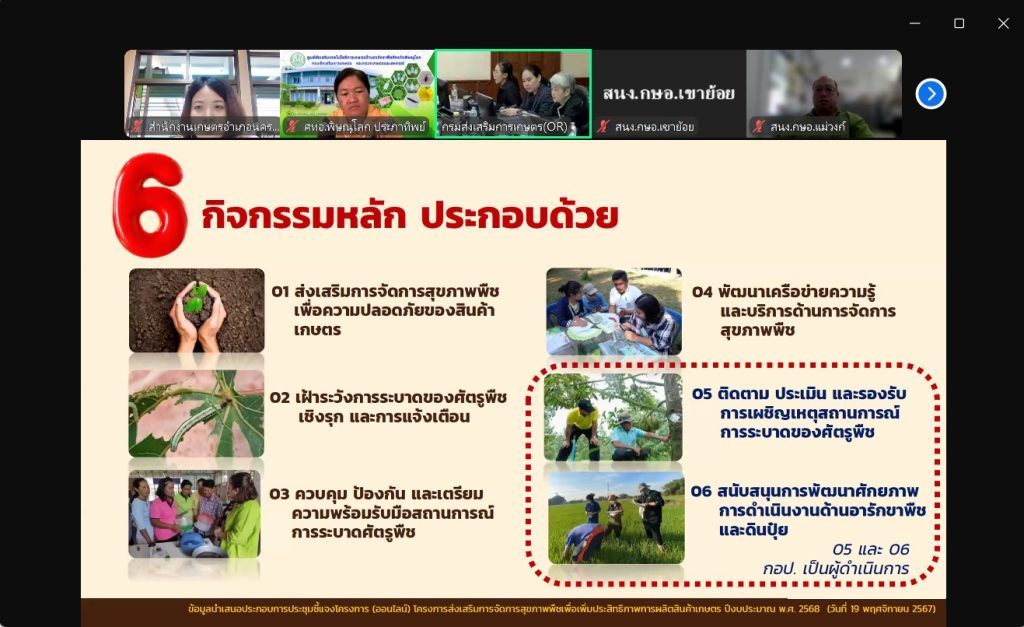 วันที่ 19 พฤศจิกายน 2567 นางสาวปานทิพย์ วงษ์แก้ว เกษตรอำเภอนครไทย มอบหมายให้นางสาวสุภาภรณ์ ตลังตอง นักวิชาการส่งเสริมการเกษตรปฏิบัติการ และนางสาวขนิษฐา ทองรุ่ง นักวิชาการส่งเสริมการเกษตร ร่วมประชุมประชุมชี้แจงโครงการส่งเสริมการจัดการสุขภาพพืชเพื่อเพิ่มประสิทธิภาพการผลิตสินค้าเกษตร ปีงบประมาณ พ.ศ.2568 ณ สำนักงานเกษตรอำเภอนครไทย จังหวัดพิษณุโลก โดยมีกิจกรรมหลักที่ต้องดำเนินการกิจกรรมโครงการฯ ดังนี้ 1.กิจกรรมส่งเสริมการจัดการสุขภาพพืชเพื่อความปลอดภัยของสินค้าเกษตร 2.กิจกรรมเฝ้าระวังการระบาดของศัตรูพืชเชิงรุกและการแจ้งเตือน 3. กิจกรรมควบคุม ป้องกัน และเตรียมความพร้อมรับมือสถานการณ์การระบาดศัตรูพืช 4. กิจกรรมพัฒนาเครือข่ายความรู้และบริการด้านการจัดการสุขภาพพืช และการดำเนินงานศูนย์จัดการศัตรูพืชชุมชน ศูนย์จัดการดินปุ๋ยชุมชน ในปีงบประมาณ 2568 โดยมีนายพีรพันธ์ คอทอง อธิบดีกรมส่งเสริมการเกษตร เป็นประธานเปิดการประชุม จัดโดยกองส่งเสริมการอารักขาพืชและจัดการดินปุ๋ย ผ่านระบบออนไลน์