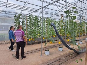 นางสาวพีรดา จันทร์เกษร เกษตรอำเภอพรหมพิราม มอบหมายให้ นายธนธร จบศรีและนางคนึง สมบุญมี นักวิชาการส่งเสริมการเกษตรปฏิบัติการ ร่วมกับสภาเกษตรจังหวัดพิษณุโลก เยี่ยมเยือนวิสาหกิจชุมชนหนองมะคังผักกางมุ้ง เพื่อสอบถามแนวทางการจัดการระบบน้ำอัจฉริยะในโรงเรือนเมล่อน