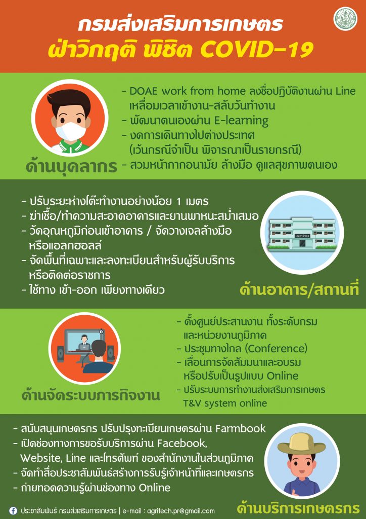 นายเข้มแข็ง ยุติธรรมดำรง อธิบดีกรมส่งเสริมการเกษตร เปิดเผยว่า กรมส่งเสริมการเกษตรได้วางมาตรการเฝ้าระวังการแพร่ระบาดของเชื้อไวรัสโคโรนาสายพันธุ์ใหม่ 2019 (COVID-19) ซึ่งสอดคล้องกับนโยบายของรัฐบาลและกระทรวงเกษตรและสหกรณ์ โดยมีการปรับแผนการทำงานทั้ง 4 ด้าน ได้แก่ 1) ด้านบริการเกษตรกร กรมส่งเสริมการเกษตร สนับสนุนให้เกษตรกรปรับปรุงทะเบียนเกษตรกรผ่านแอปพลิเคชัน Farmbook พร้อมเปิดช่องทางให้เกษตรกรขอรับบริการผ่านช่องทางออนไลน์ต่างๆ ได้แก่ เว็บไซต์ เฟซบุ๊ค ไลน์ และโทรศัพท์ ของสำนักงานในส่วนภูมิภาคทั่วประเทศ ทั้งนี้ กรมส่งเสริมการเกษตรยังจัดทำสื่อประชาสัมพันธ์สร้างการรับรู้ และถ่ายทอดความรู้ด้านการเกษตรผ่านช่องทางออนไลน์ เช่น เว็บไซต์ เฟซบุ๊ค ยูทูป เพื่อให้เกษตรกรสามารถเรียนรู้จากที่บ้านได้ 2) ด้านการจัดระบบภารกิจงานส่งเสริมการเกษตร ได้จัดตั้งศูนย์ประสานงานทั้งระดับกรมและหน่วยงานภูมิภาค ปรับระบบการทำงานส่งเสริมการเกษตร T&V System สู่การดำเนินงานบนระบบออนไลน์ เช่น การประชุมทางไกลผ่านระบบอินเทอร์เน็ต (Video Conference) เพื่อลดการพบปะโดยตรง รวมทั้งเลื่อนการจัดอบรมและสัมมนา หรือปรับเป็นการดำเนินการในรูปแบบออนไลน์แทน ทั้งนี้ กรมส่งเสริมการเกษตรมั่นใจว่าจะสามารถให้บริการเกษตรกรและประชาชนได้อย่างต่อเนื่อง นอกจากนี้ กรมส่งเสริมการเกษตร ยังช่วยเพิ่มช่องทางออนไลน์ในการกระจายผลผลิตทางการเกษตรให้แก่เกษตรกรในช่วงสถานการณ์ COVID-19 โดยเปิดพื้นที่ออนไลน์ เช่น นำเสนอข้อมูลแหล่งจำหน่ายสินค้าเกษตรคุณภาพดี ผ่านทางเฟซบุ๊ค “ประชาสัมพันธ์ กรมส่งเสริมการเกษตร” เพื่อเป็นทางเลือกให้กับผู้บริโภค และยังเป็นการช่วยลดผลกระทบให้กับเกษตรกรอีกทางหนึ่ง