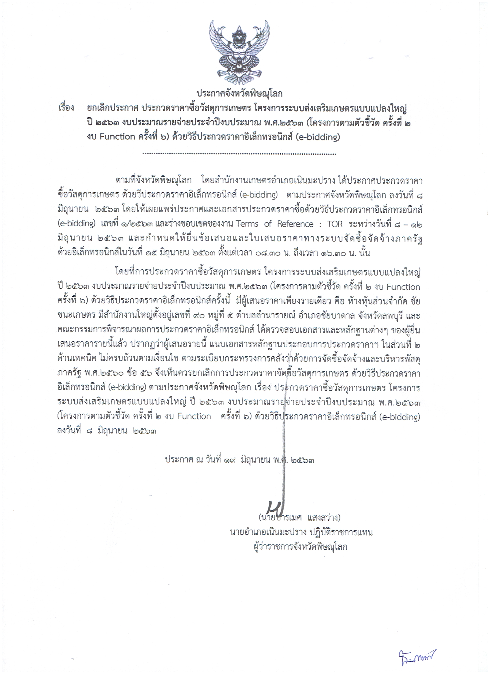 เรื่อง ยกเลิกประกาศประกวดราคาซื้อวัสดุการเกษตร โครงการระบบส่งเสริมการเกษตรแบบแปลงใหญ1 ปี 2563 งบประมาณรายจ่ายประจำปีงบประมาณ พ.ศ. 2563 (โครงการตามตัวชี้วัดครั้งที่ 2 งบ Function ครั้งที่ 6 ด้วยวิธี ประกวดราคาอิเล็คทรอนิคส์ (e-bidding)