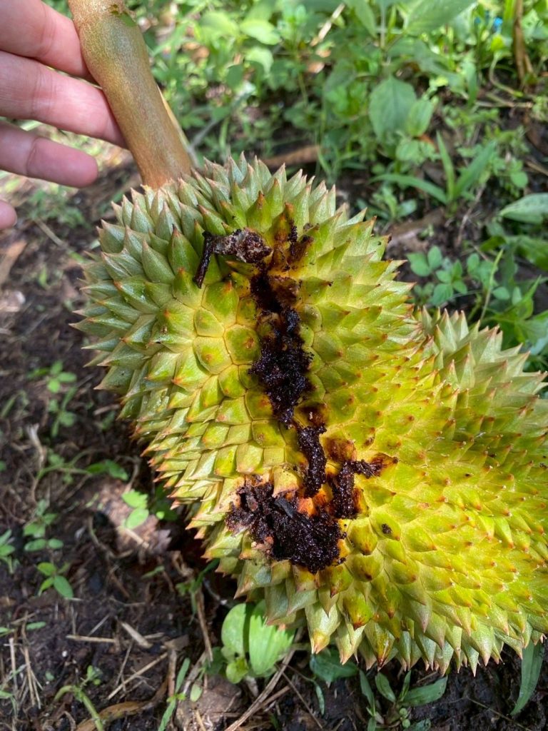 โดยจากการสำรวจและวินิจฉัยเบื้องต้น คาดว่าอาจเกิดจาก หนอนเจาะผลทุเรียน เพราะวินิจฉัยตามอาการภายนอกของพืช (Symptoms) และสิ่งที่ปรากฏบนพืช (Signs) ข้างต้น แต่เพื่อความแม่นยำในการวินิจฉัย เจ้าหน้าที่ได้ลงเก็บตัวอย่างหนอนมาวิเคราะห์วงจรชีวิต และระยะเวลาการเจริญเติบโต เพื่อหาแนวทางการจัดการป้องกันได้อย่างมีประสิทธิภาพ จากนั้นได้แนะนำวิธีการควบคุมและป้องกันการระบาดเพิ่มเติม โดยใช้วิธีการจัดการศัตรูพืชแบบผสมผสานIPM (Integrated Pest Management) ได้แก่